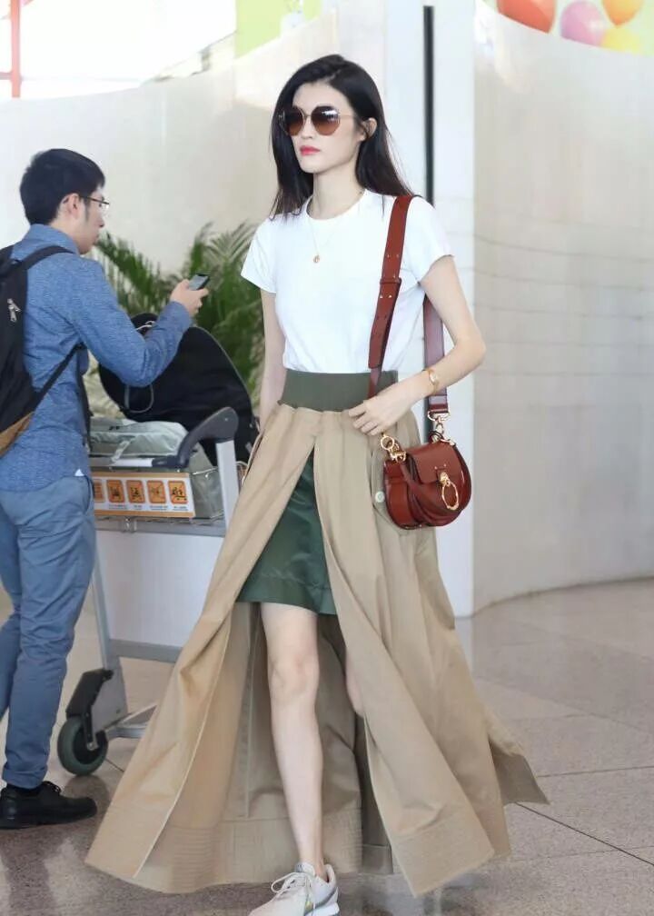 白色的短袖搭配的裙子非常有个性,裙子里面还包了一件绿色的短裙,也就何穗敢这样穿了吧,一般人也穿不出这样的个性