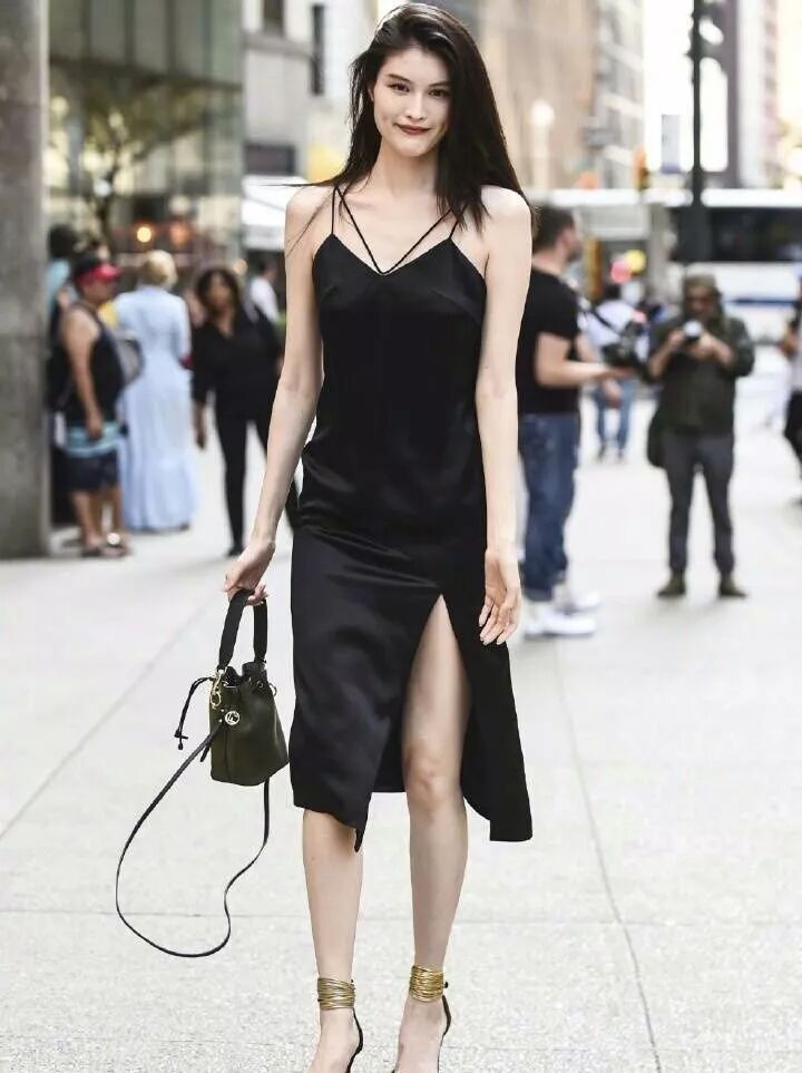 黑色的吊带长裙特别的性感,而且裙子还是开叉的,更加的有特色了,但是何穗脚上的金色的东西不知道是啥,实在是博人眼球啊