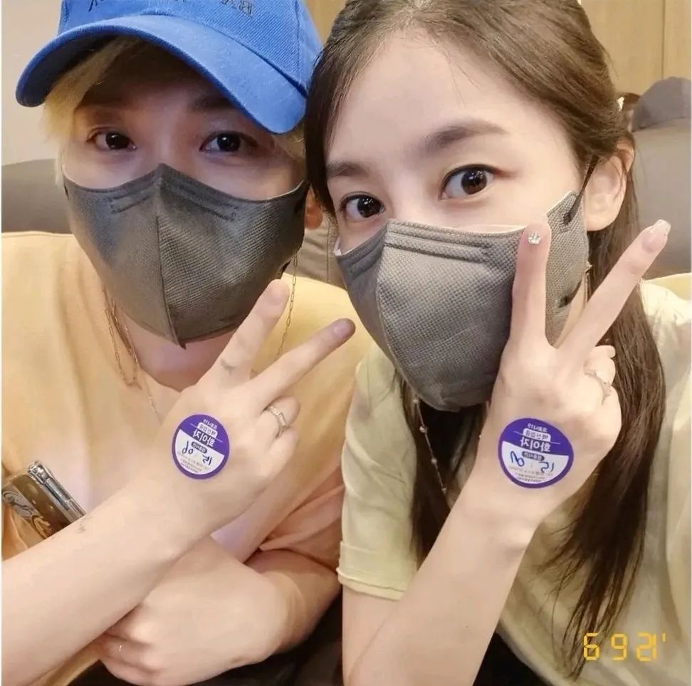 和金思恩戴着口罩和接种疫苗贴纸的晟敏说:“时间过得比想象中还要快,没有太大的副作用。”结婚七年的夫妇俩摆着V姿势甜蜜合影。