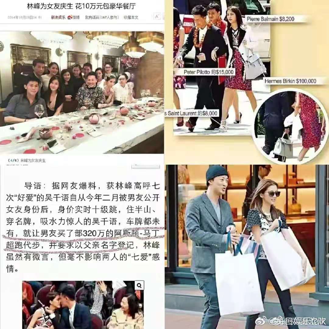 再看看林峰的前女友吴千语的待遇:花10万包下餐厅过生日,平时各种大包小包名牌包,甚至送320万的超跑!