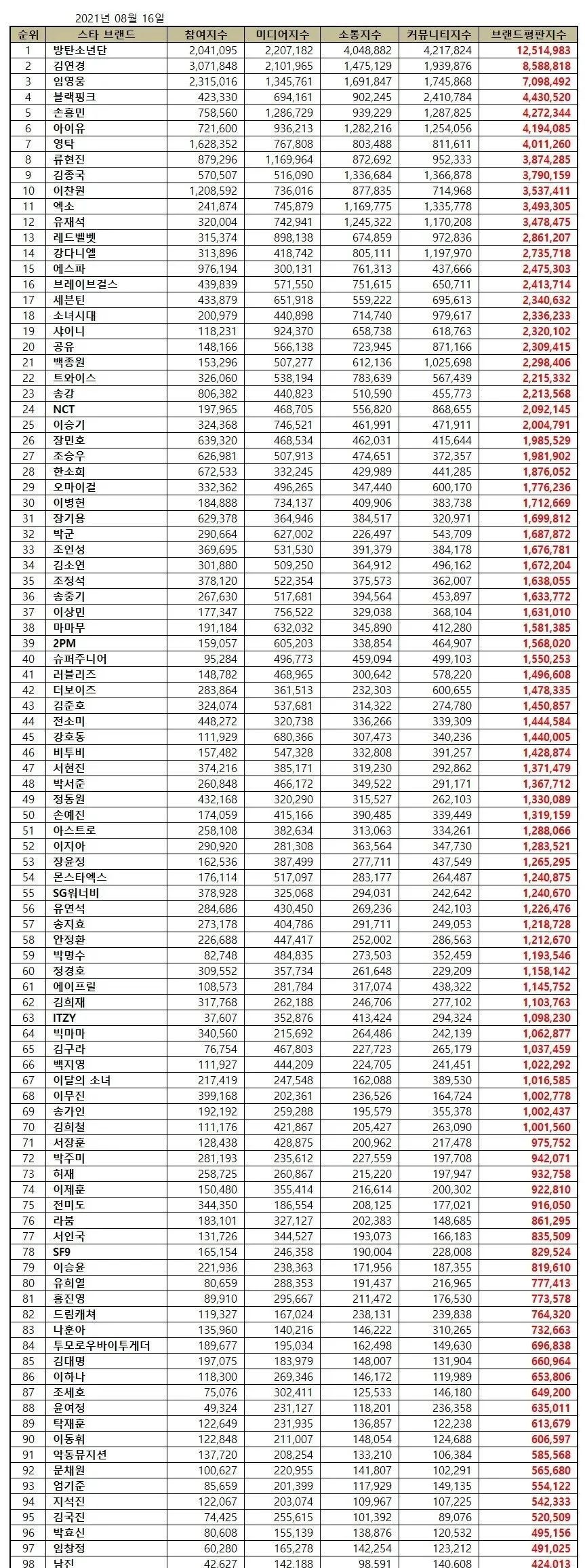 [8月明星品牌评价] 根据韩国企业评估研究所2021年7月16日至2021年8月16日针对韩国消费者的品牌参与指数、媒体指数、沟通指数、社区指数项目对100名明星的数据进行分析。