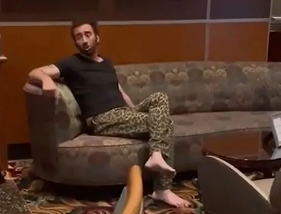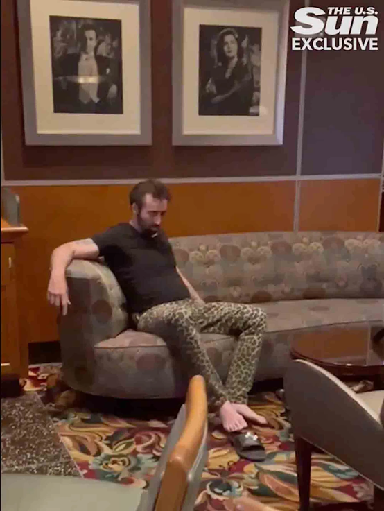 的确,视频中可见尼古拉斯·凯奇穿着豹纹裤子、黑色T恤,整个人看起来比电影上消瘦了不少。他懒散地坐在沙发上,光着脚,鞋子被丢在远处。