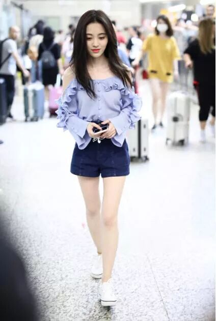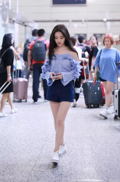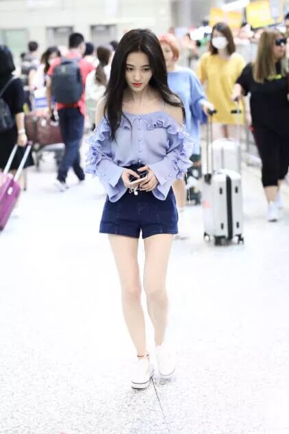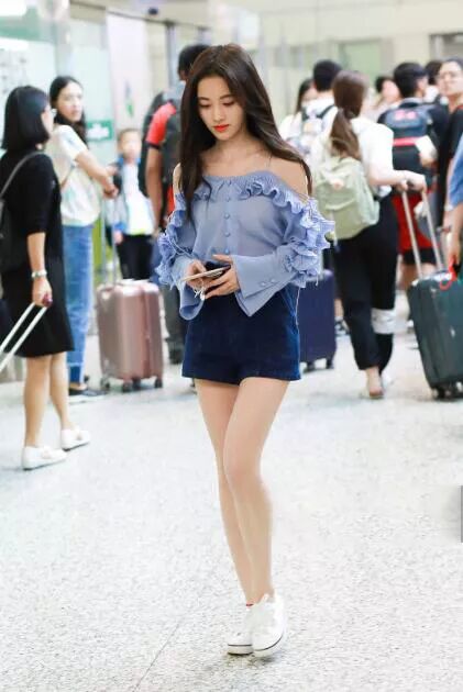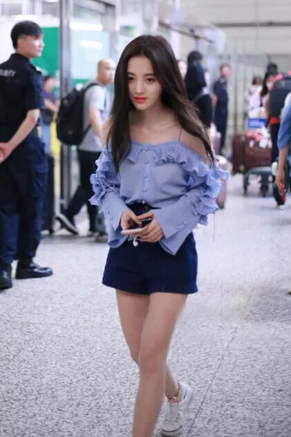 近日,鞠婧祎现身机场,鞠婧祎真敢穿!荷叶边上衣只用两根线挂着,网友:滑下来就尴尬