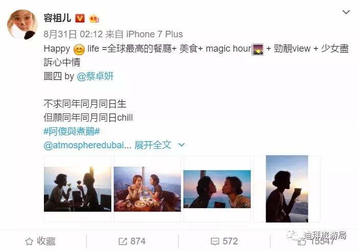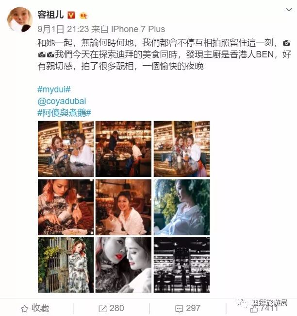 在迪拜大饱口福后,容祖儿不禁“诗兴大发”,她在微博上写道:“不求同年同月同日生,但求同年同月同日Chill。”你想和谁一起来迪拜同年同月同日吃?快把这篇微信转给她吧!