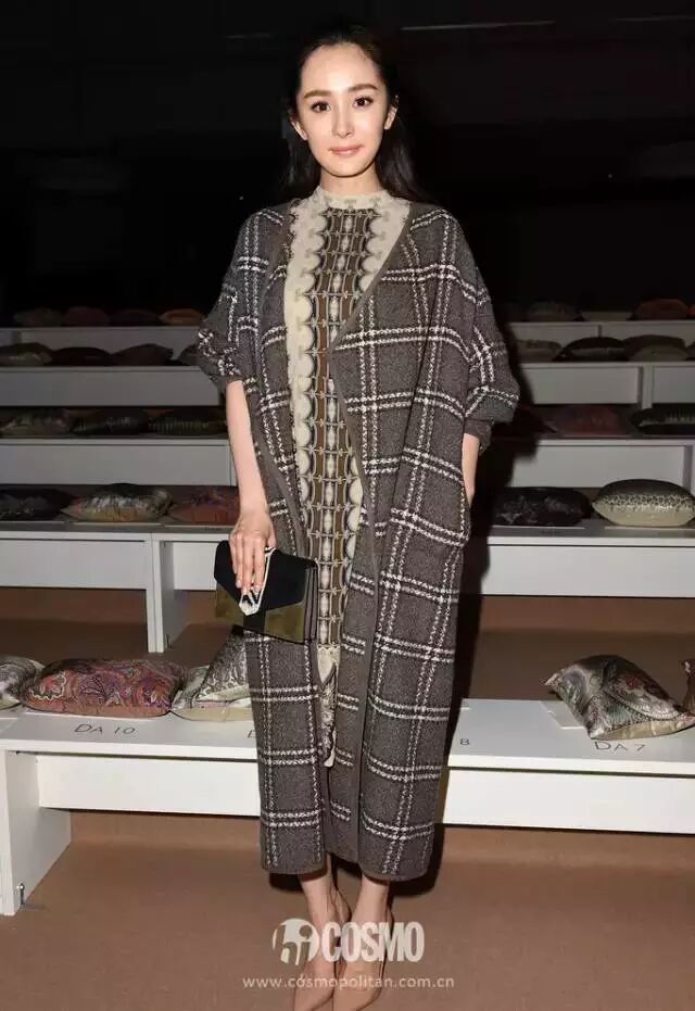 大幂幂的超长款大格子外套内搭同色系的连衣裙,
