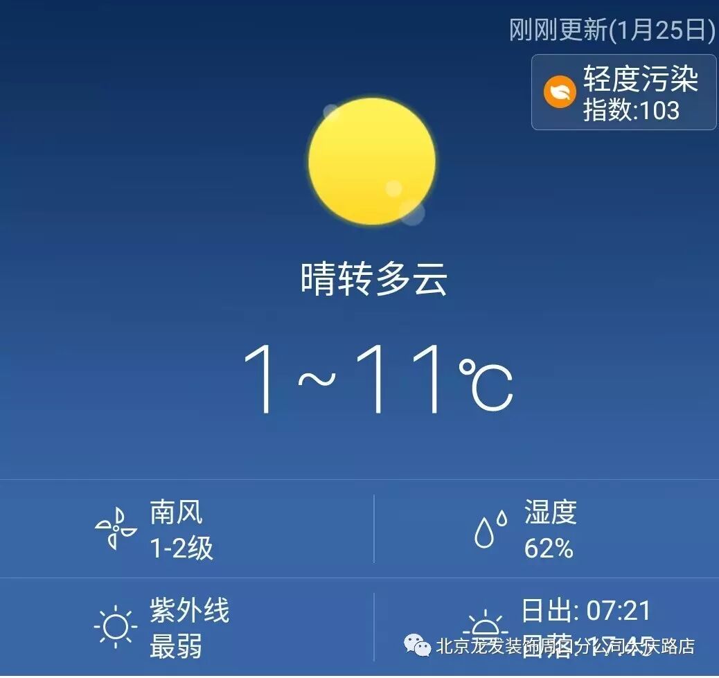 【1月25日天气预报】今天白天到夜间晴转多云,空气质量轻度污染,南风1~2级,高温11℃低温1℃;