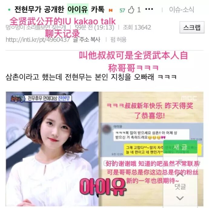 2017MBC演艺大赏的获奖者全炫茂公开和IU kakaotalk的聊天记录