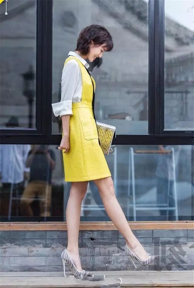 黄色连体裙里衬一件浅白色衬衫,时尚年轻的气息油然而生,非常吸引目光。灰白相间条纹细跟高跟,更加增添了她身材的优美姿色。微笑间,倘佯着一种活泼气质,年轻而又有活力。