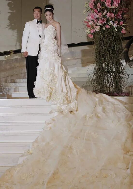 陈慧琳身上的主婚纱,由香奈儿老佛爷亲自操刀设计,另一套则是由香港顶级设计师奚仲文为她量身定做,上面绣满999朵陈慧琳最爱的香槟色牡丹。