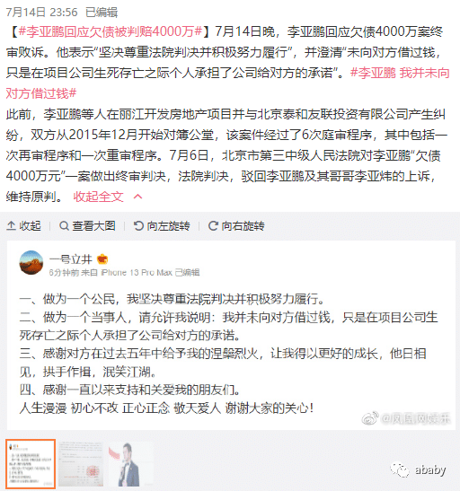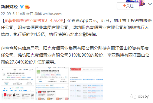 事实上,李亚鹏的官司纠纷错综复杂,尽管败诉但他声称不曾向对方借过钱,只是一个承诺,会尊重法院的判决努力履行,同时感谢对方让他成长得更好。这段文案妙笔生花,有当作家的潜质,可惜现实很骨感,公司被执行4.5亿,李亚鹏和妻女的生活却不受影响。
