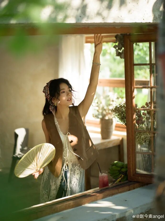侧边的卷发和装饰的头巾,田园感满满,在木质的窗边拿着蒲扇,阳光的倾洒和花草的光影,显示着岁月静好的氛围感。