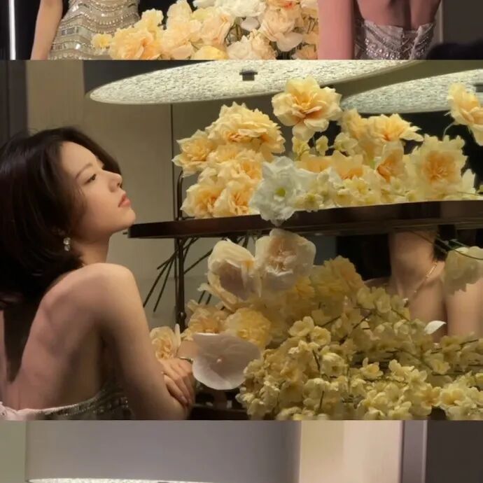 花朵的拍摄置景不仅增加了整体妆造的柔和感,还多了一丝氛围感。