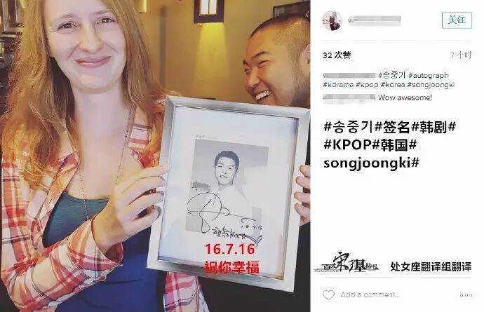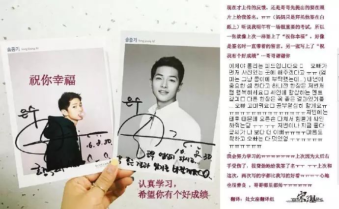 宋仲基朋友的孩子通过其个人账号PO出宋仲基签名,并配文:现在才上传的反馈。还是哥哥先提出的要在照片上给我签名。(妈妈只是拜托他签在白纸上)听说我明年有一场很重要的考试,所以一张就像上次一样签上了“祝你幸福”,好像是签名时一直带着的留言。另一张写上了“祝我有个好成绩”…哥哥谢谢你我会努力学习的。上次因为太后右手受伤了,很费劲地给我签了名。上次和这次,两次写的字都比我写的好看。心地也很善良 ,哥哥哪里都帅。PO主还上传了一张后续图,并配文:其实空手来也可以的。还给我妈妈带了零食的哥哥也真是的…这样的话,我不是又心动了嘛~。(签名翻译:祝你幸福~认真学习,希望你有个好成绩)