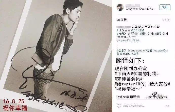 8月31日, 网友通过个人社交账号发布了宋仲基签名照,并配文:现在刚到办公室#下雨天#惊喜的礼物##宋仲基演员#给topten10的,给大家的#"祝你幸福~"。