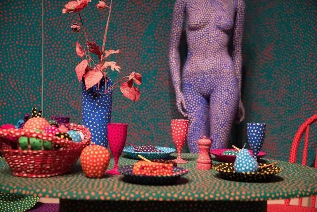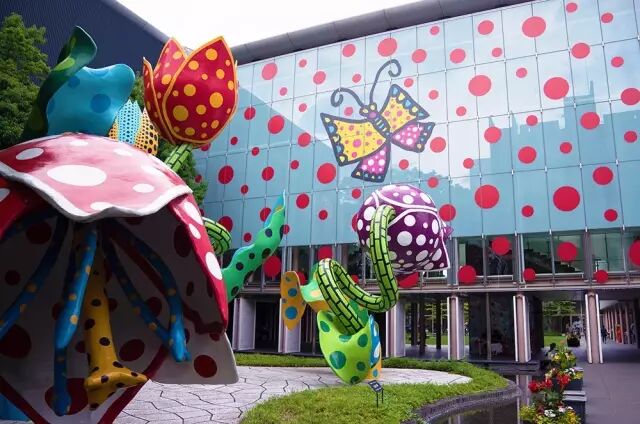 美术馆的中庭中展示着草间弥生的代表作品“幻之华”,坐在馆内的咖啡馆就能将其尽收眼底。