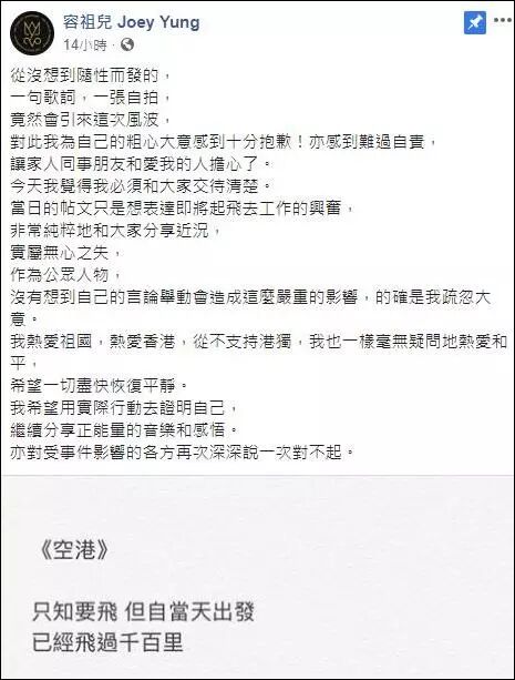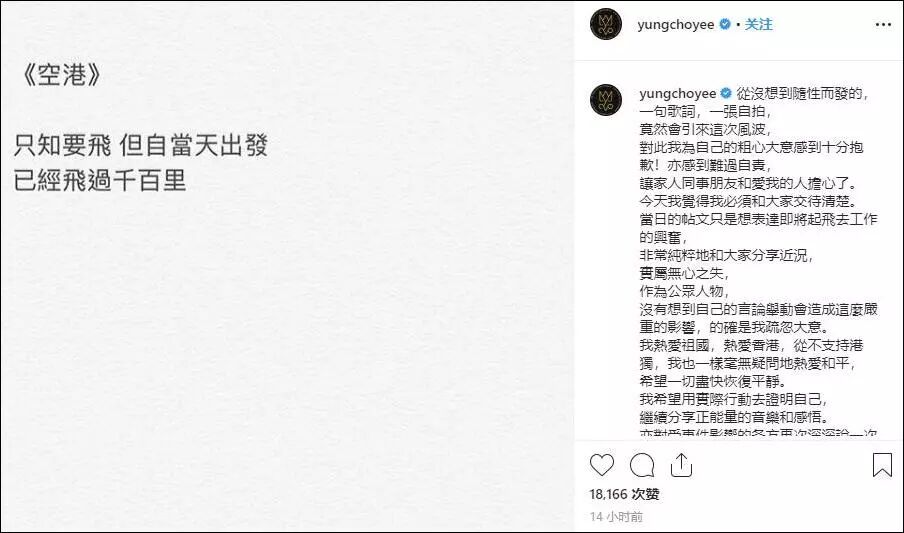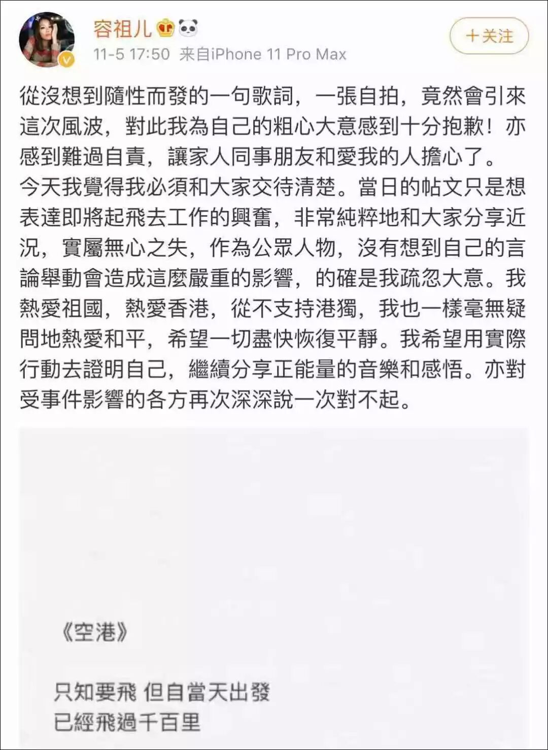 她表示:“今天我觉得我必须和大家交待清楚。当日的帖文只是想表达即将起飞去工作的兴奋,非常纯粹地和大家分享近况。我热爱祖国,热爱香港,从不支持‘港独’,我也一样毫无疑问地热爱和平,希望一切尽快恢复平静。”