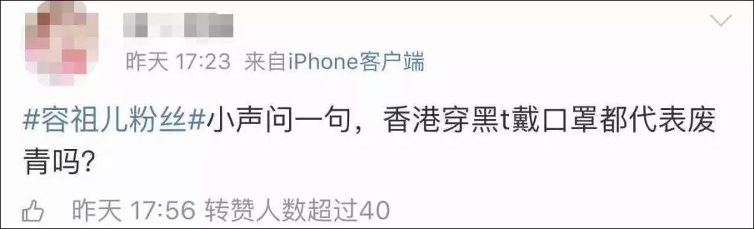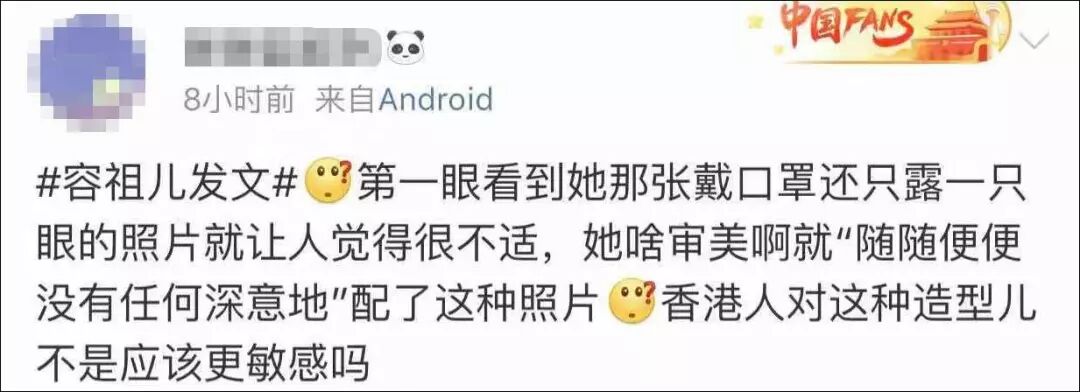 “口罩”、“遮眼”、“黑衣”,这三个近期经常出现在香港暴徒身上的“标志”在容祖儿身上出现,部分网友认其存在“港独”嫌疑;