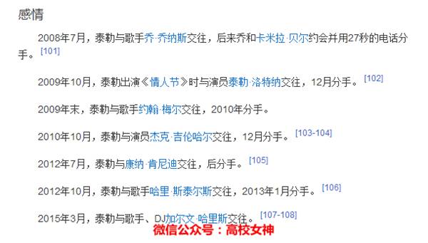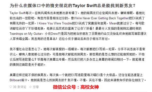 段子的主角就是TaylorSwift,除了她优越的身材、闪耀的长相,Taylor的情史也是备受关注。当然,这个段子是夸张了很多,不过对比起其他艺人,Taylor的绯闻和恋情确实算是蛮多的。