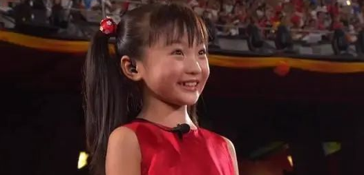 在全球40亿人的注目下,扎着双马尾的林妙可,一身红裙,演唱了让她成名的《歌唱祖国》,天真烂漫。