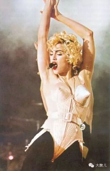 真正内衣外穿应该是Madonna从1990年的Blond Ambition Tour开始的,当年麦当娜选择了Jean Paul Gaultier所设计的尖锥胸罩内衣作为演唱会的服装,随后在全球引起大批骚动。