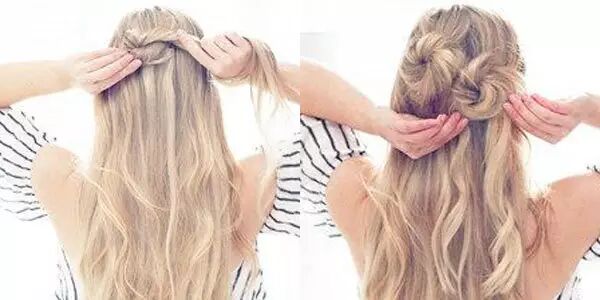 STEP1:从耳上各挑出3厘米宽发束,交叉拧转成花朵模样,并用小卡子固定。