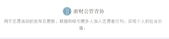 公管青协自成立之初便积极参与下城区区政府青年公益中心组织的“爱心大篷车”进社区活动,今年九月份,该组织正式升级成为浙江省博爱青年志愿者公益中心,公管青协建立“浙江财经大学分队”成为其十二支志愿者分队之一。