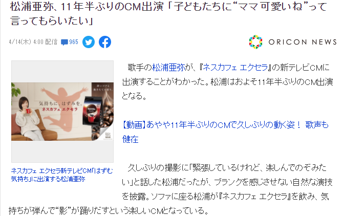 爷青回,日本这位最强偶像终于要复出了吗!? 日剧大放送 日韩女星 2022-04-20 20:00:58 832 创作不易,用心坚持,欢迎请BaGua喝几杯爱心咖啡!打赏并支持本文 打赏并删除本文 日剧大放送日剧/日影/动漫 日剧日影爱好者的大本营据日媒报道,歌手松浦亚弥将出演雀巢咖啡的新广告,这也是她时隔11年半再次出演CM。此外,松浦还担任了广告的主题歌。参加录音的工作人员听到压轴的歌声后,有人甚至表示:我要哭了…我也要哭了…谁的青春回来了!?当被问及拍摄感想时,松浦亚弥表示:好久没这么紧张了!当我通过镜头看自己的时候,我意识到自己真的上年纪了。想让孩子们说“妈妈好可爱啊!”,一边回想着或生气或欢笑的日常生活,一边放松自己,尽量让自己保持在自然的状态。2013年8月,松浦亚弥和w-inds.的主唱橘庆太宣布两人正式结婚。当时,松浦透露,两人到冬天为止已经交往12年了,我的青春都有他的陪伴。悲伤、痛苦、快乐、高兴…全部都有他的身影。(谁的青春没有他啊555)俩人婚后低调恩爱,育有3个孩子。这对真的是郎才女貌!要知道,当初松浦亚弥可被称为“平成最后的solo偶像”。2000年,14岁的她参加了第4回早安少女的选拔。虽然松浦觉得自己表现不佳,提问也没能好好回答,不过她依旧合格了。同年10月,松浦亚弥出演了迷你日剧《美·少女日记》正式作为演员出道了。2001年,她就带着单曲《LOVE涙色》登上了第52届NHK红白歌会的舞台。作为偶像歌手,她接连推出的《100回のKISS》、《桃色单恋(♡桃色片想い♡)》、《Yeah!めっちゃホリディ》等单曲都受到了无数听众的好评,松浦亚弥也因此连续6年出现在红白歌会的舞台之上。当然,她也和其他成员组成过限定组合为大家带来表演。后松藤(ごまっとう)▼後浦なつみ▼DEF.DIVA▼GAM▼(部分)而在努力发展音乐事业的同时,松浦亚弥也没有放弃自己的演员活动。2003年,她和二宫和也共同出演了电影《青之炎》。松浦亚弥也因此获得了第18届高崎电影节最佳新人女演员。2004年,松浦亚弥主演了电视剧《爱情一本!》。除此之外,她在巅峰期时接广告接到手软,甚至还在2004年被评为年度日本广告好感度女性部门的第一名。想当初,谁没被ayaya的歌声甜到捂心口呢!?单纯可爱又开朗,给人一种令人心动的清纯形象。穿着可爱的服装,表情和舞蹈的表现力都很厉害,松浦亚弥拥有着无条件吸引所有观众的魅力。“她出现的时候,那种明亮热闹的气氛,就像是五颜六色的糖果突然洒了出来。让那些因为不景气而被剜去喜悦的人们重新振作,松浦亚弥拥有着能使枯萎的心复苏的力量。”而她老公橘庆太应该也是一大批人的青春回忆吧。2000年,橘庆太所在的组合w-inds.在正式出道前每周日都会在涩谷进行街头表演。而观众也从最初的3名逐渐扩张,最后甚至动员了8000名观众。2001年3月14日,他作为w-inds.的主唱正式出道。而他们同年发行的单曲《Paradox》就获得了日本唱片大赏最优秀新人奖。同时,首张专辑《w-inds.~1st message~》也获得了ORICON第一名。《Forever Memories》《Feel The Fate》…随便一首歌都能跟唱出来。2006年,橘庆太以个人名义推出了单曲《道标》。并在2013年以“KEITA”的名义推出单曲《Slide 'n' Step》,并在涩谷举行了发售纪念LIVE。时间流逝,w-inds.人气可能不如之前,但是大家依旧在认真创作歌曲。2020年,成员绪方龙一因为身体原因决定退出。现在由橘庆太和千叶凉平两个人作为w-inds.继续活动。唱歌、跳舞、乐器、创作…在音乐领域中,似乎没有他做不到的事情。他也曾为了练习发声而专门跑去美国学习理论知识。而KEITA则表示,自己要成为日本最能唱能跳的3娃父亲~相恋21年,松浦亚弥和橘庆太一如既往地低调且恩爱。2018年4月,杂志《女性自身》拍摄到了松浦亚弥和橘庆太一起出现在长女的幼儿园入园仪式的现场。这也是他俩少有的同框照之一。这么多年过去了,他们两位的眼底始终只有对方,一起小心翼翼地守护着这份感情,互相支撑着对方的工作和事业。在这个分分合合都很正常的娱乐圈中,这样的爱情实在过于美好…— End —撰稿:yone图源:网络审校:Reihei、Lee 创作不易,用心坚持,欢迎请BaGua喝几杯爱心咖啡!打赏并支持本文 打赏并删除本文 感谢您的支持鼓励,我会继续努力的!文章地址:用户邮箱:打赏金额:USDT 请输入数字点击”去打赏“,即可进行打赏支持本文章哦 松浦亚弥 About the Author 日剧大放送 功能介绍:欢迎来到日剧大放送,这里是日剧日影爱好者的大本营! Related Posts 爷青回,日本这位最强偶像终于要复出了吗!? 2022-04-20 20:00:58 豆瓣评分9.1!这部日剧刷爆朋友圈,没看过也太遗憾了! 2022-04-18 20:00:20 去年收视率最高的10部日剧!照着刷,准没错! 2022-04-15 20:01:01 获日本奥斯卡12项提名!这部日本电影颜值超高,却有很多人表示不敢看… 2022-04-13 20:00:52 上户彩、武井咲、林志玲…原来女神都被这个顶级男团娶走了!? 2022-04-11 11:27:45 发表评论