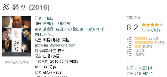 评分却是高的很:豆瓣8.2,好于90% 悬疑片、好于 91%的同性片的日本电影。