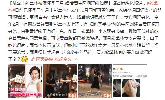 熊黛林在去年10月同郭可盈胞弟、家族坐拥百亿资产的郭可颂结婚,更传她说鸡年会努力造人。婚后她减少了工作,专心调理身体。今年2月,有网友曾经看到熊黛林去上环,有“妇科圣手”之称的中医刘逢吉看医调理身体,直到最近终于有好消息。