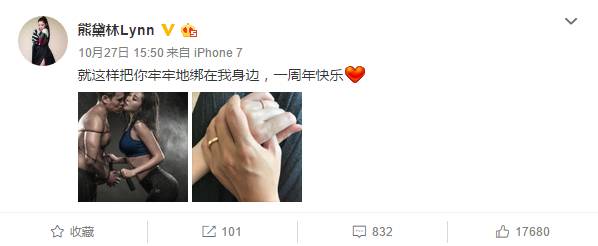 婚后的熊黛林有意减少工作量,享受幸福生活。前几天还在微博撒狗粮秀恩爱,庆祝结婚一周年。