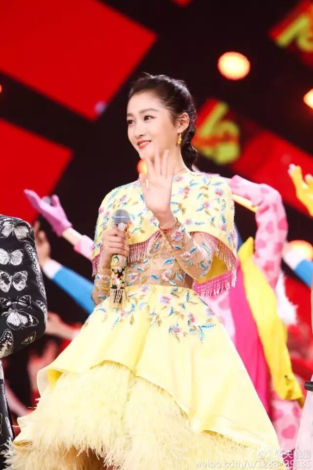 其中,关晓彤量身定制的明黄色百花刺绣礼服