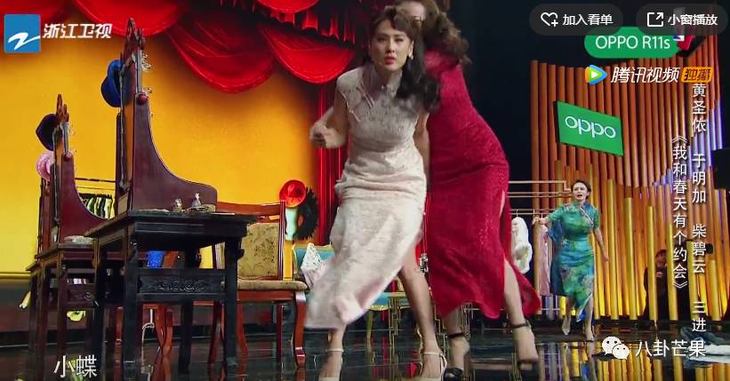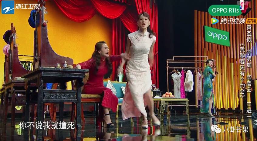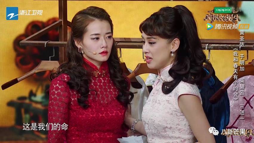 柴碧云(红色)和于明加(绿色)发生争执,黄圣依就像个木偶一样走位,表情像尿急。