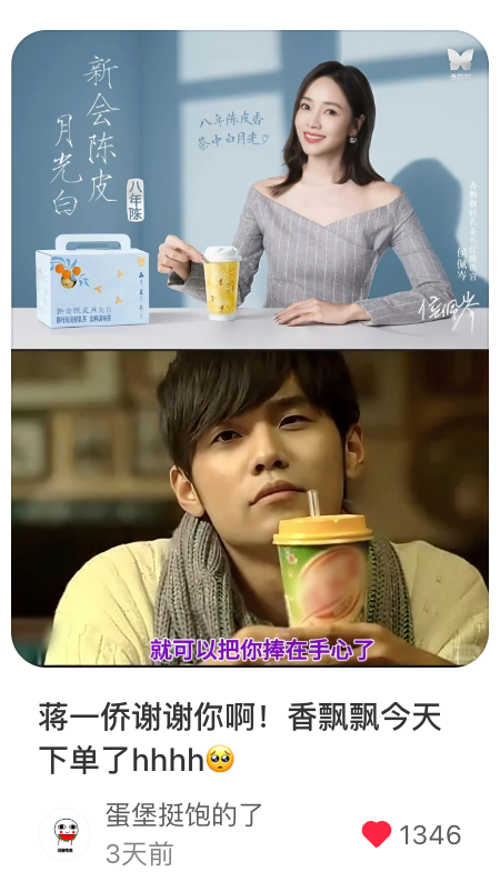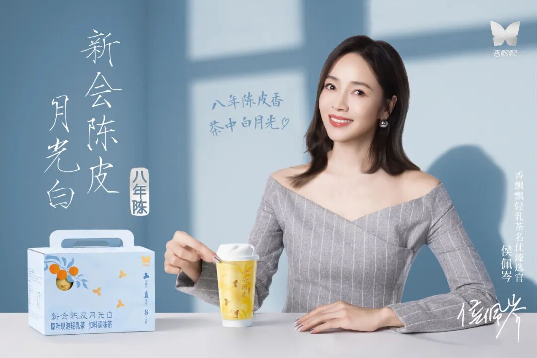 回看这次和侯佩岑一起出现在海报上的“新会陈皮月光白轻乳茶”,不仅让人在视觉上产生联想,让消费者感知到白月光香飘飘回归的杀伤力,也用陈皮、月光等元素,也让大家感受了这一杯在原材料上的质感。