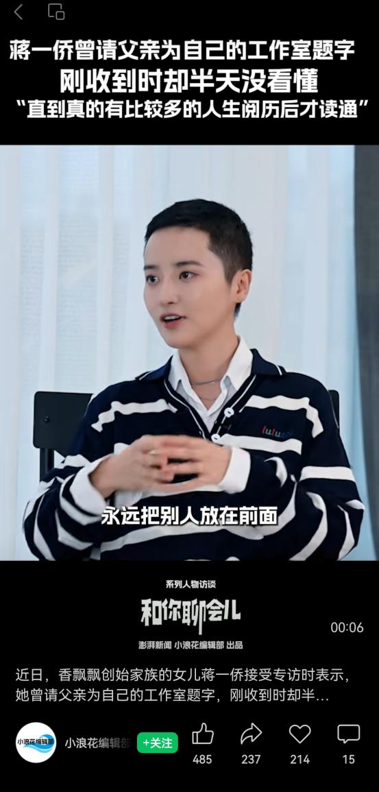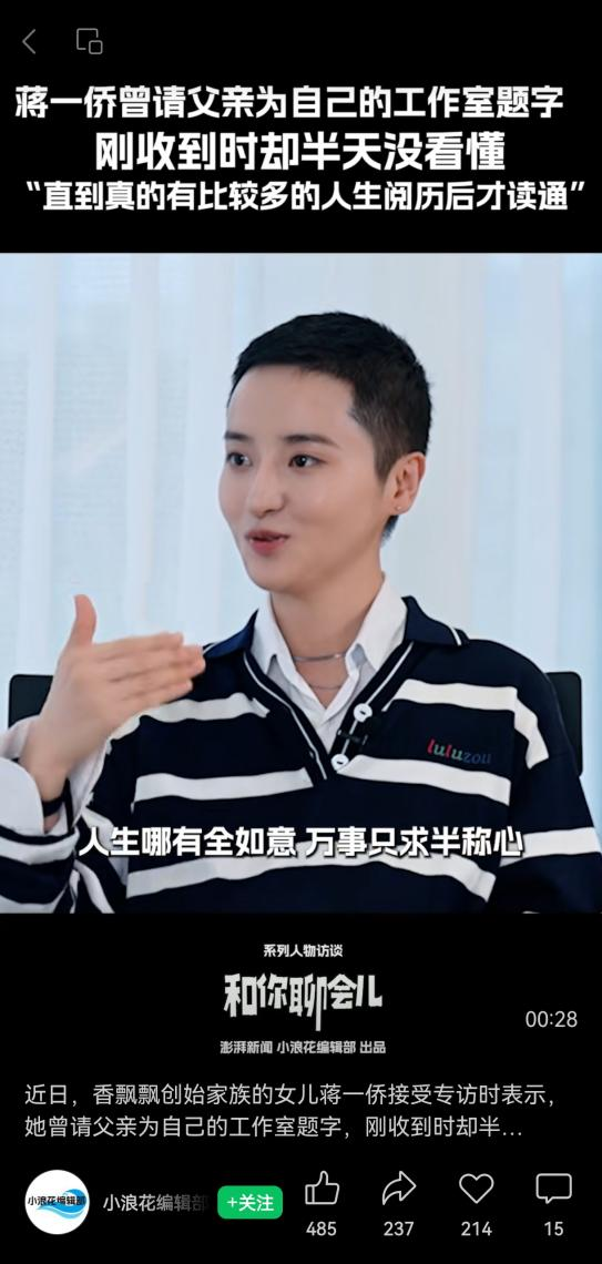 而这种清醒且谦逊的态度,大抵也是来自家里的言传身教。蒋一侨曾请父亲为自己的工作室题字,然而也是在多年之后,蒋一侨才看懂父亲写下的那句“人生哪有全如意,万事只求半称心”,那幅字的落款是“蒋二”,也是希望她能永远把别人放在前面。