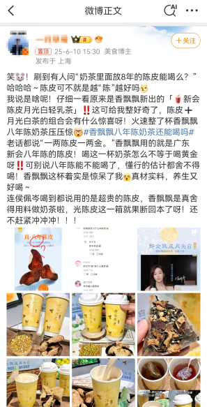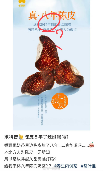 这款奶茶刚刚出街时,还有网友在小红书上“质疑”,但是懂行的人很快就懂了这一杯的“含金量”——老话说“一两陈皮一两金”,新会八年陈皮在粤圈可是硬通货级别的存在,是能当嫁妆的好东西。而且陈皮健脾解腻,白茶清热降火,二者的融合不仅在味道上很符合,也非常适合当代年轻人“中式养生”的诉求。
