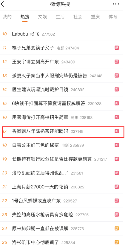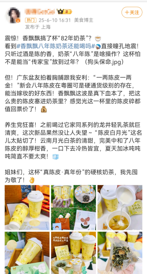 最近,香飘飘又对着整个奶茶圈贴脸开大。品牌不仅官宣在“浪姐”中圈粉无数的侯佩岑姐姐作为新的代言人,还推出了一款非常特别的新品“新会陈皮月光白轻乳茶”,一时间,关于#香飘飘八年陈奶茶还能喝吗#的讨论,成了诸多网友热议的对象。