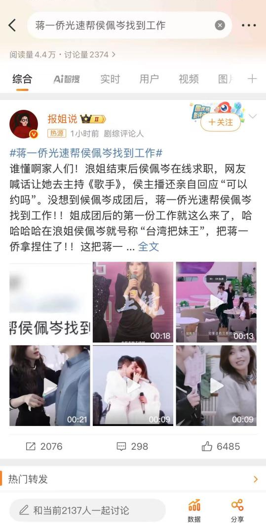 面对粉丝的“安利”,蒋一侨直接回复大家说“甜甜的香飘飘,必须配甜甜的佩岑姐啦!”这并不是什么客套话,侯佩岑曾在成团后“在线求职”,称可以接受主持、广告、综艺等工作邀约,而蒋一侨也是光速帮侯佩岑找到了新工作,很多网友都表示#蒋一侨对侯佩岑的爱太实在了#。毕竟爱她就给她商务资源、给她展示机会,这才是真·霸总。
