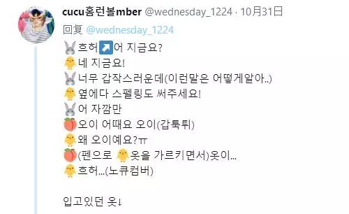 当他在想的时候珍荣建议叫“O-ee(오이)”因为她的衣服上印着52(发音=O-ee) 【衣服图2】但是O-ee也是黄瓜的意思