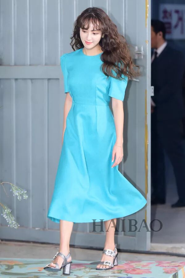 郑惠成2018年4月26日身着Fayewoo蓝色连衣裙现身品牌活动