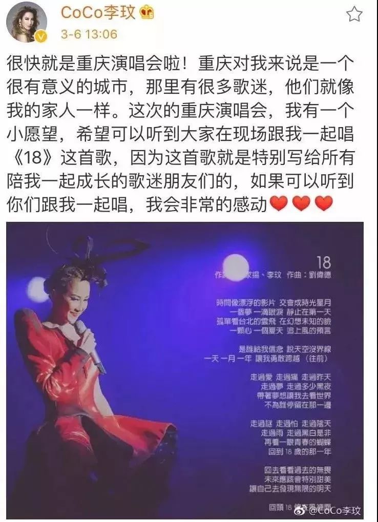 前两天,李玟自己也发微博向重庆歌迷问好,表达了自己对于巡回演唱会重庆场的期待。