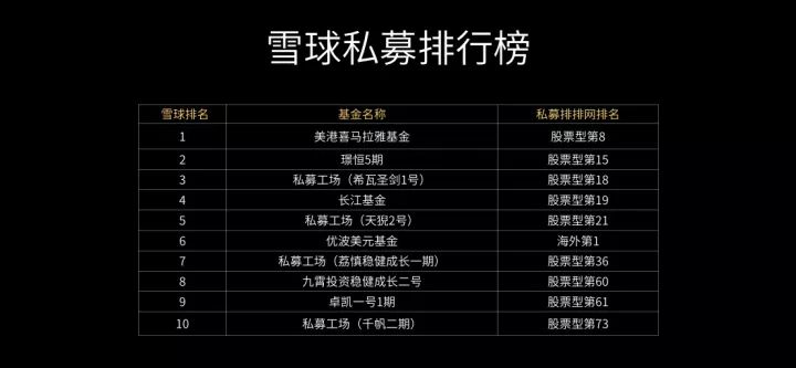 整体来看两个榜单,一个是雪球上排名前十的私募基金,右边是它们在整个市场的排名(见PPT)。大家可以看见,雪球上这些排名靠前的基金,在整个市场上,垄断了前几十名的排名,表现可以说是非常的优秀。所以,投资这些产品是有可能获得超额收益的。