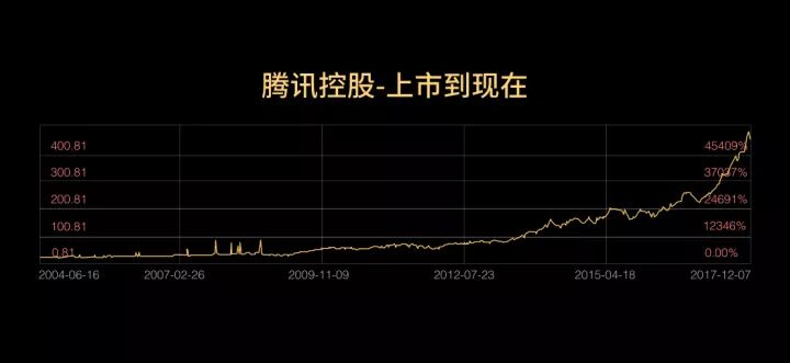 我们再把视野放得大一点,再给大家看几只股票,这一只股票叫做腾讯,从上市以来涨了多少呢?涨了454倍,不是454%,是454倍。它上市以来,好像做了唯一的一件事情就是不停的上涨。当然,它今年也涨了很多,今年涨了106%。