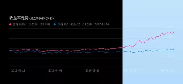 下面的蓝线是沪深300,上面的红线是雪球私募工场的表现比较好的基金,这是2015年5月13号创立的,上一轮牛市的高点附近,到现在这只基金创造了152%的回报,同期的沪深300指数下跌了13.2%。