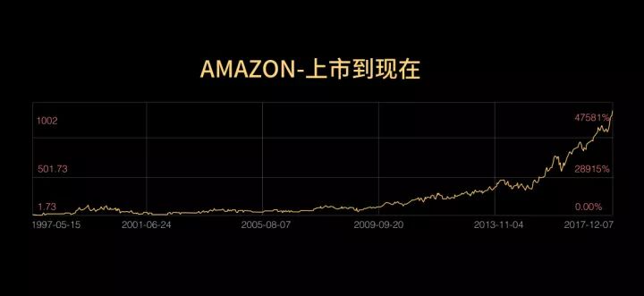 再来看一只上市更长一点时间的,而且经历过2001年科网股票泡沫的股票,叫亚马逊。我们知道科网股破灭的下跌,对这只股票来说仅仅是一笑微小的波动,它做的事情也是在永远的上涨。