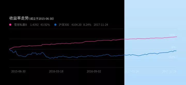 这个产品是2015年6月30号创建,在2015年的牛市已经崩溃之后,但是现在用一条直线创造了43.92%的收益,同期的沪深300指数只上涨了8.2%,这就是超额收益。