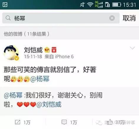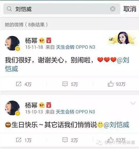 而两人的互动更是少得可怜,15年,也就是两人新婚不久,应该还是如胶似漆的时候。在杨幂的主页上搜索刘恺威,相关的微博,主要就是生日祝福,帮老公刘恺威和闺蜜唐嫣宣传新戏……