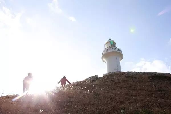 海边的灯塔上方阳光升起,却看不到未来,唯有相拥而泣。