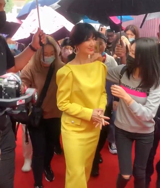 可以看到赵雅芝穿的这一条黄色礼服并不是很好看。因为裙子本身就比较宽松,也不是修身的款式,所以显得很松垮,尤其是她胸部的那一块显得更加邋遢,再加上衣服颜色这么亮,看起来她的皮肤就是暗黄发黑的模样。整个人也是面色憔悴,所以这张照片中的她精神状态完全不在线,感觉她自己都有一点不自信了。
