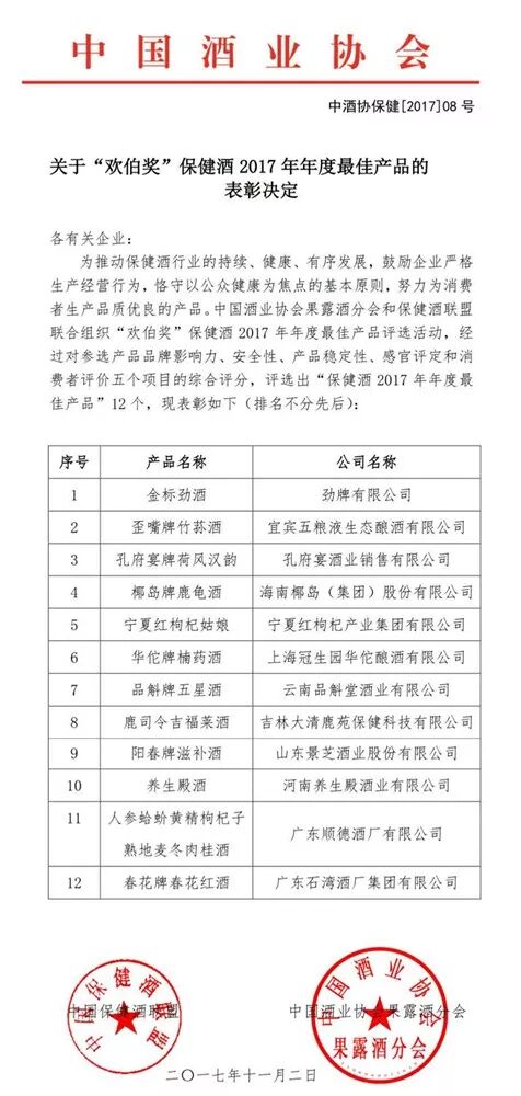 据悉,获得此次“欢伯奖”2017年度保健酒最佳产品的有(排名不分先后):劲牌金标劲酒、歪嘴牌竹荪酒、椰岛牌鹿龟酒、品斛牌五星酒、鹿司令吉福莱酒、孔府宴牌荷风汉韵、宁夏红枸杞姑娘、华佗牌楠药酒、阳春牌滋补酒、养生殿酒、红荔牌人参蛤蚧黄精枸杞子熟地麦冬肉桂酒、春花牌春红花酒共计12款产品。