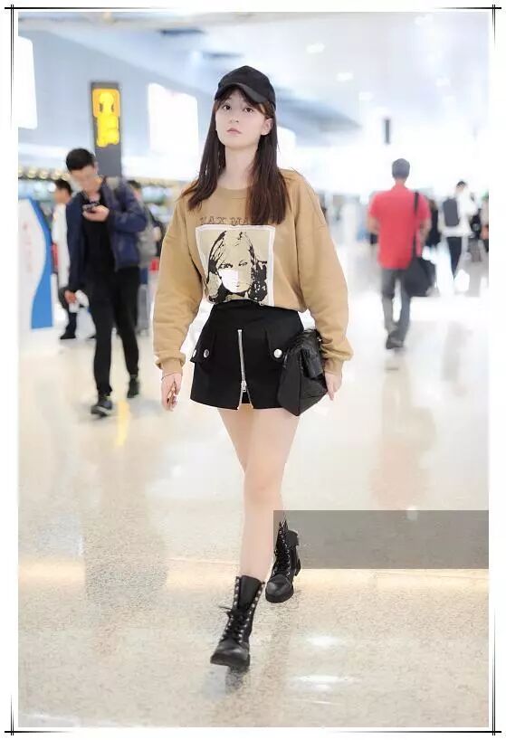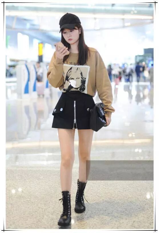 乔欣上身卡其色卫衣,卫衣上印着潮潮的图案,下身黑色超短裙,短裙的设计也是很特别,里边一层内衬外边一层用拉链拉着,仿佛很危险呐。